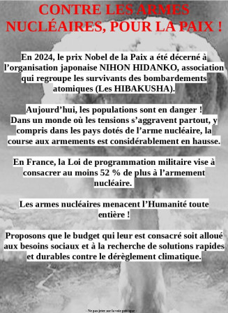 Dans le contexte d'une nouvelle courses aux armements qui va coûter des milliards d'euros et de dollars, nous refusons de sacrifier les salariés, les retraités, les jeunes aux postulats d'une guerre nucléaire absurde, ruineuses, criminelle et suicidaire.