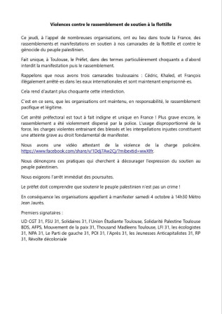 UD CGT 31, FSU 31, Solidaires 31, l’Union Étudiante Toulouse, Solidarité Palestine Toulouse BDS, AFPS, Mouvement de la paix 31, Thousand Madleens toulouse, LFI 31, les écologistes 31, NPA 31, Le Parti de gauche 31, POI 31, l’Après 31, les Jeunesses Anticapitalistes 31, Révolution permanente 31, Révolte décoloniale